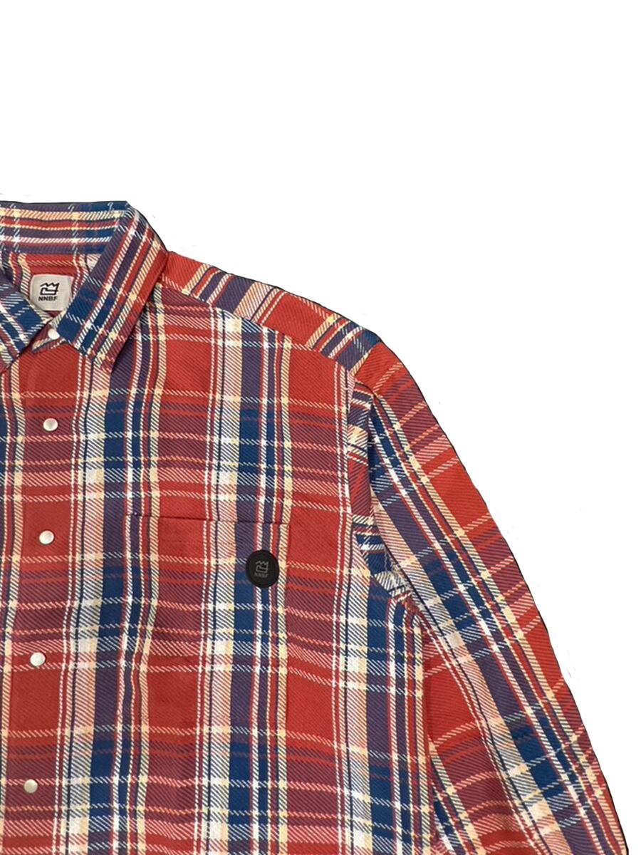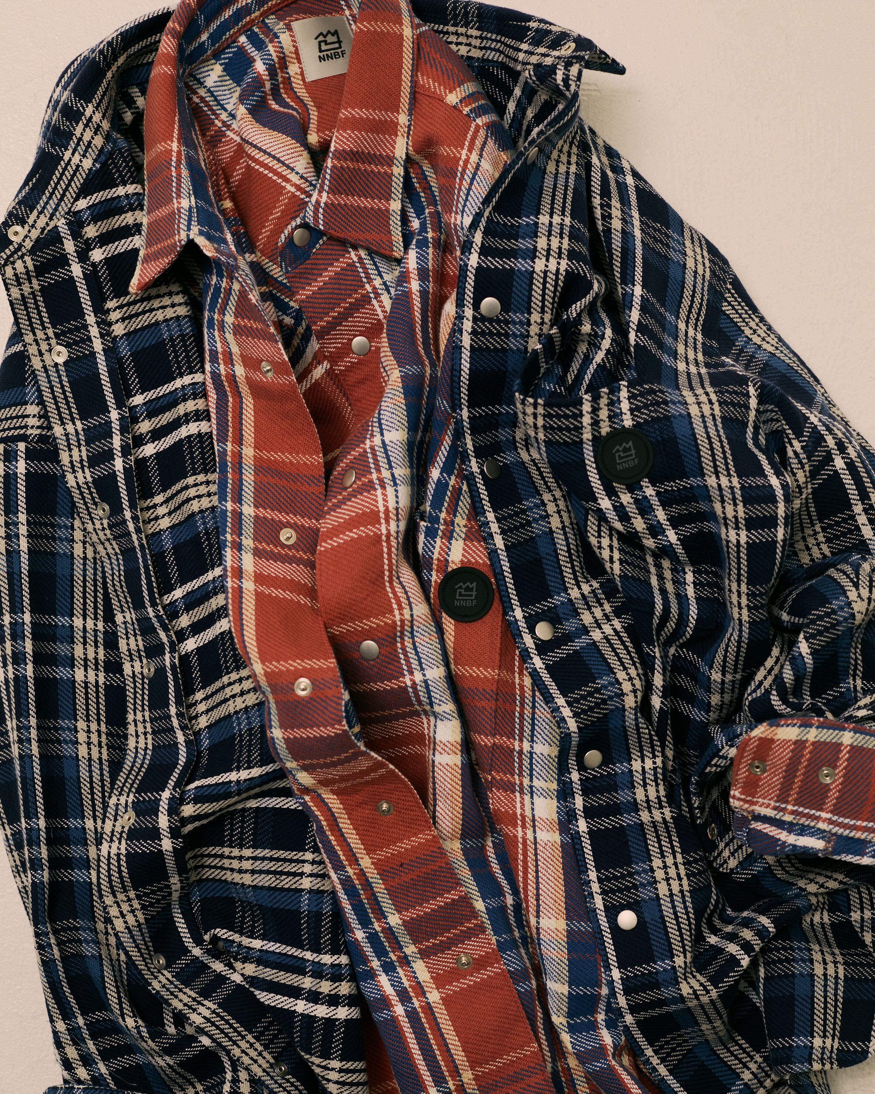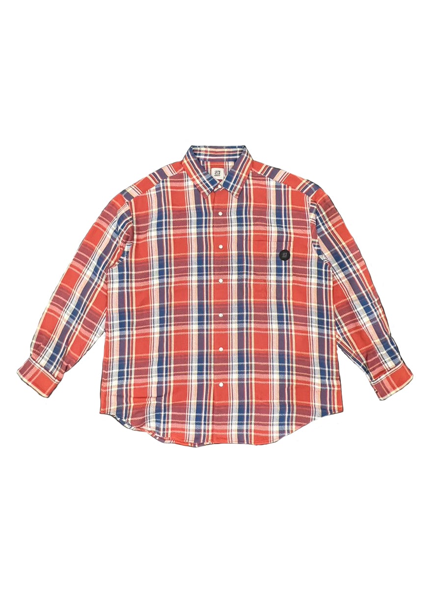 太番手糸を3本引き揃え紡いだツイルチェック柄のトリプルヤーン素材を使用したオーバーサイズシルエットのヘビーネルシャツ。