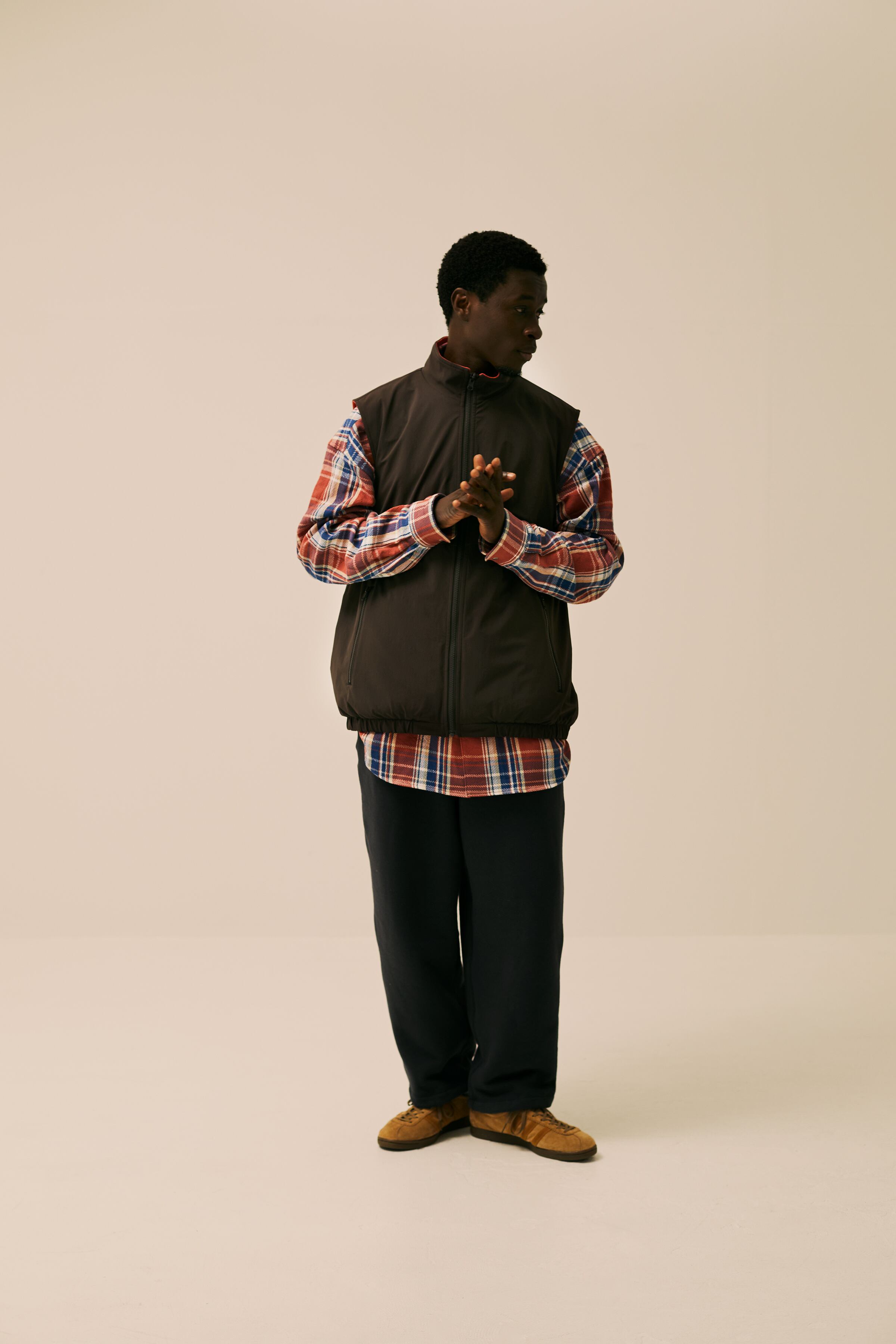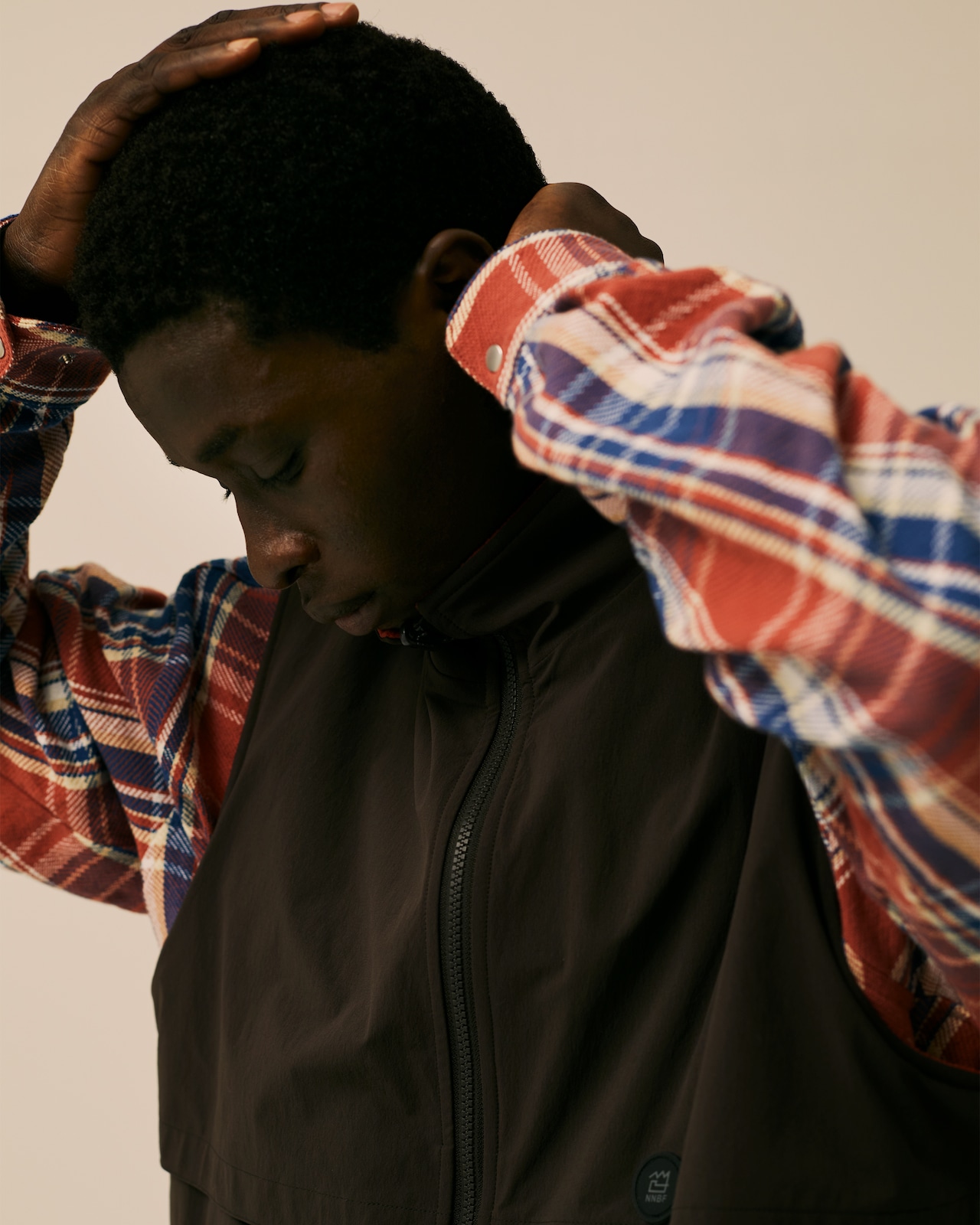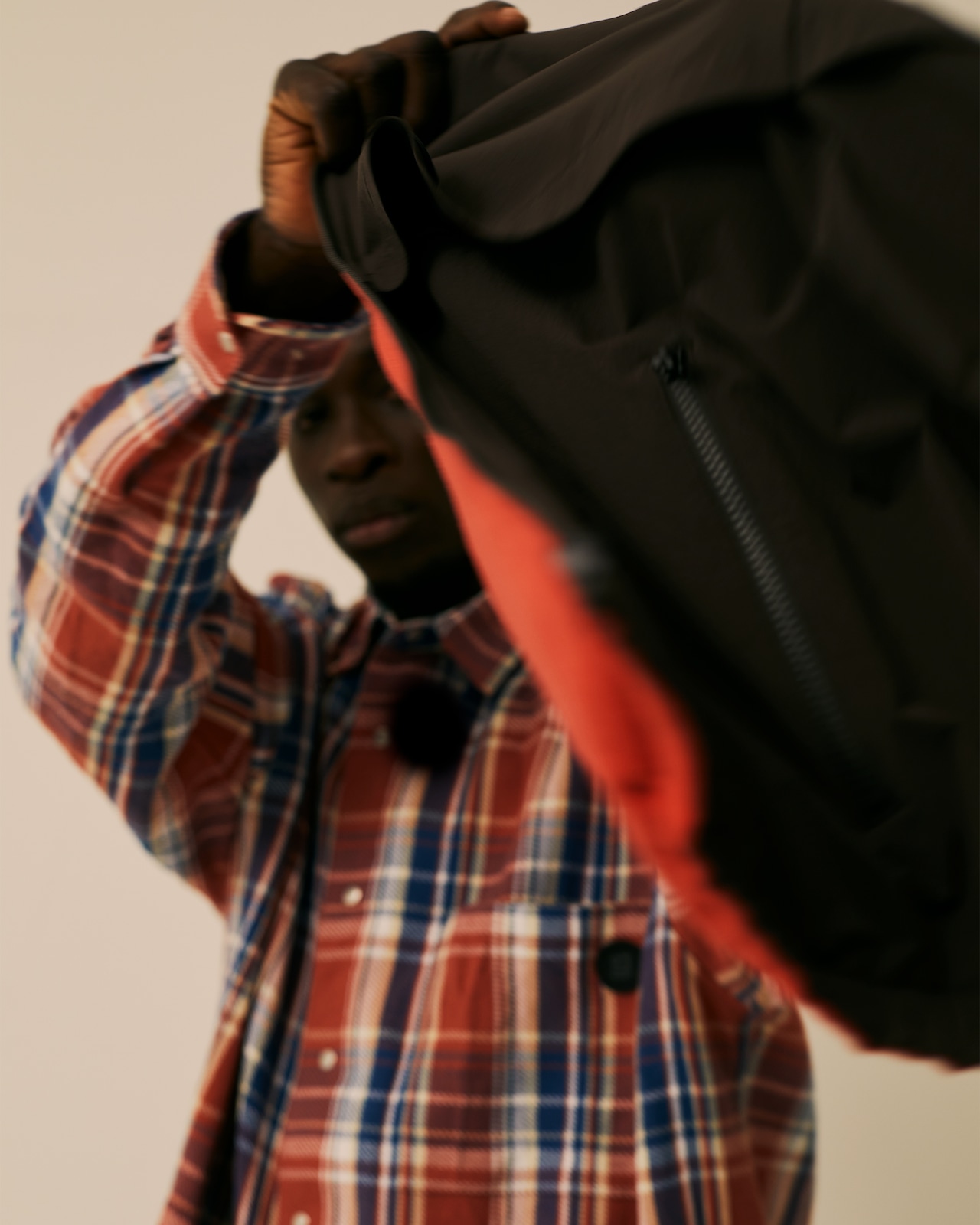 太番手糸を3本引き揃え紡いだツイルチェック柄のトリプルヤーン素材を使用したオーバーサイズシルエットのヘビーネルシャツ。